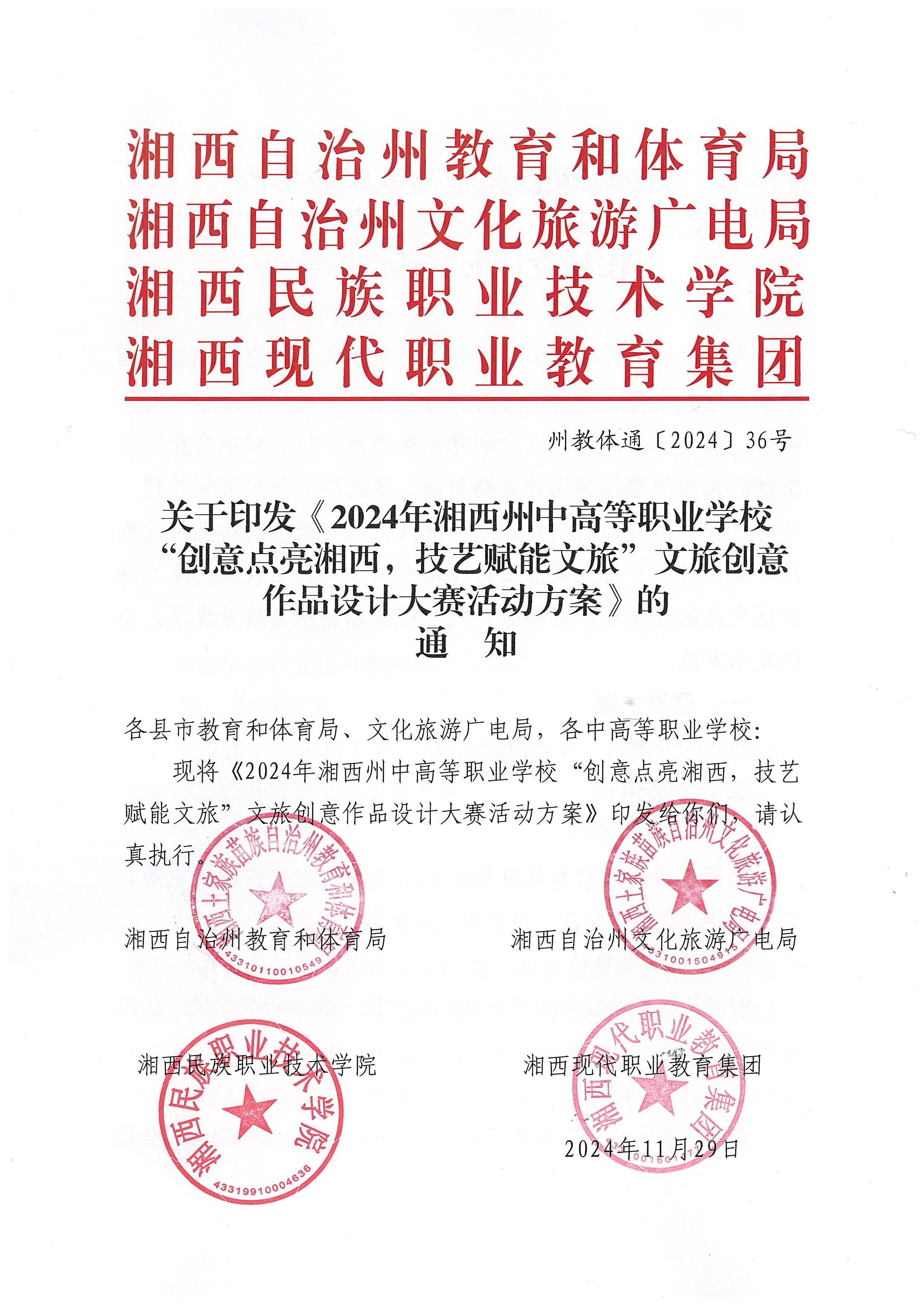 湘西自治州教育和体育局、湘西自治州文化旅游广电局、湘西民族职业技术学院、湘西现代职业教育集团。