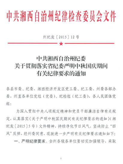 转发《中共湘西自治州纪委关于贯彻落实省纪委严明中秋国庆期间有关纪律要求的通知》