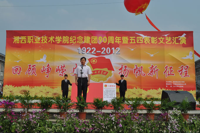 424日下午230,由湘西职院团委组织的“纪念五四运动93周年、建团90周年暨五四表彰文艺汇演”在学院中心广场隆重举行,院长李光寒、副院长罗红、副院长钟明、纪委书记刘修洪、工会主席陈杨晖,中国电信湘西分公司公共客户部主任刘晓、乾州局局长彭俊峰,以及学院各校区、处室、系部的领导同志出席了本次活动。学院纪委书记刘修洪代表学院党委作了热情洋溢的讲话。