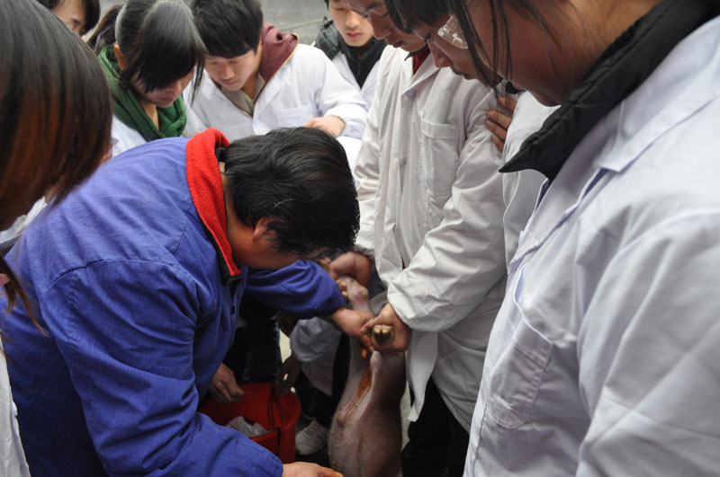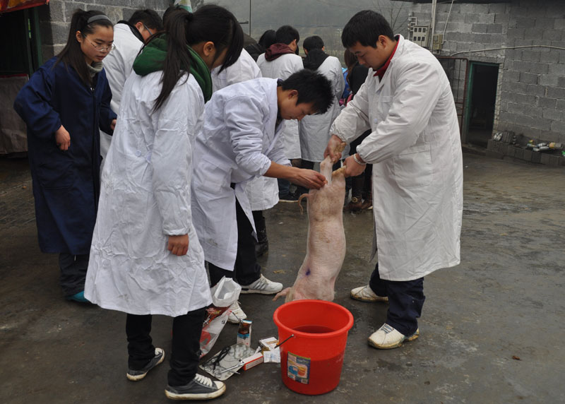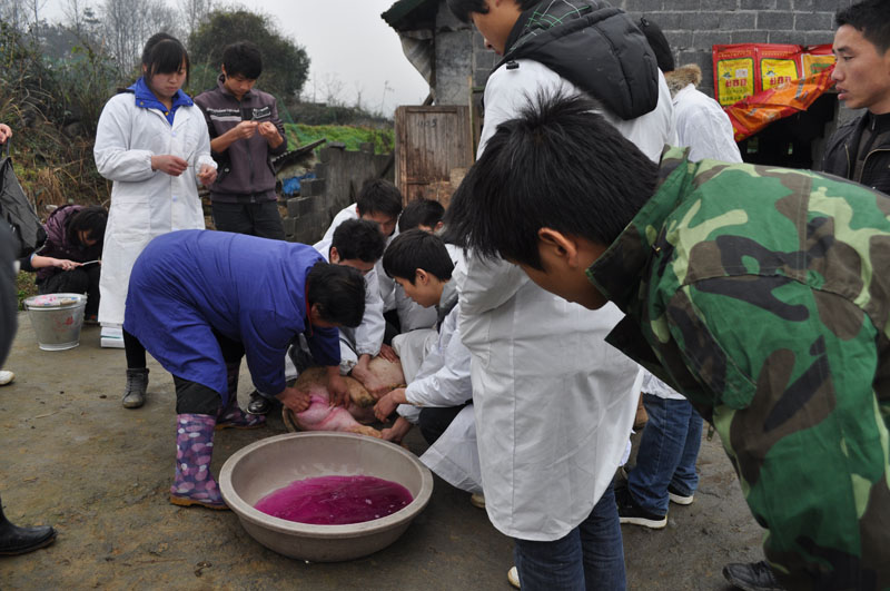 3 月25日 ,在我院畜牧专业的专家、贺宋文教授的带领下,我院畜牧专业学生来到凤凰县重点生猪养殖基地——吉信镇西门峡猪场,为养殖场的一百多头生猪进行了检查,并帮助养殖户对生猪做了阉割手术。由于该场技术力量不够,生猪养殖发展较慢,我院畜牧专业了解到这一情况后,主动与养殖场取得联系,免费上门为农户提供技术服务。此次支农活动充分发挥了我院的专业技术优势,服务了地方经济,深受当地群众的欢迎与好评。