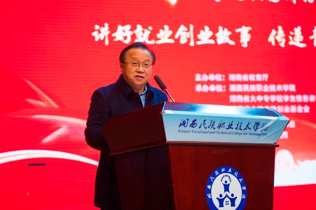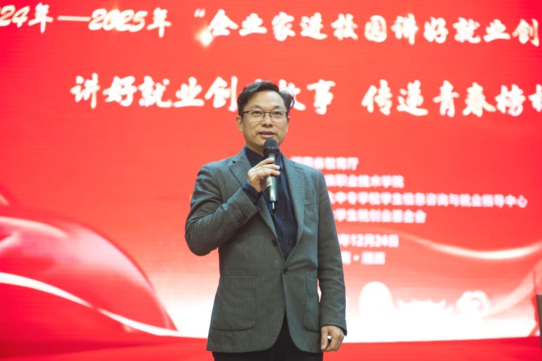 12月24日下午,由省教育厅主办,湖南省大中专学校学生信息咨询与就业指导中心、湖南省大学生就创业基金会与我校共同承办的2024-2025年“企业家进校园讲好就业创业故事”活动在我校文体会展中心展示馆举行。学校党委书记谢绍猛出席活动并致辞,党委委员、副校长白刚主持活动,数百名师生参加了本次活动。