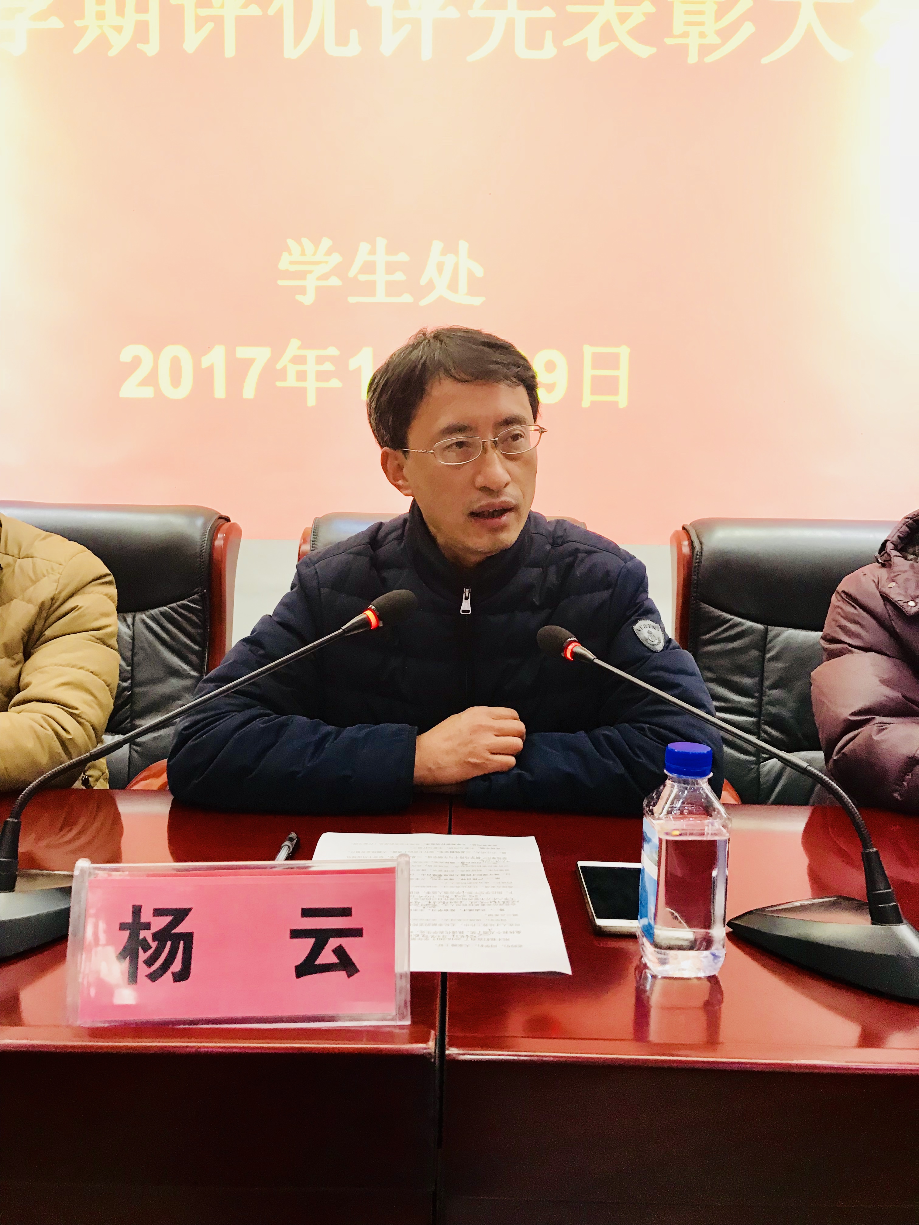 学生处处长杨云在总结发言中对获奖班级和个人表示祝贺,勉励他们在今后学习中再接再厉,同时号召广大同学向先进学习。他对同学们提出了三点要求:一是立志成才、发奋学习;二是严格自律、遵章守纪;三是自律自警,确保安全。他希望同学们努力学习,成为对国家、社会有用之人,为实现中华民族伟大复兴梦贡献自己的力量。