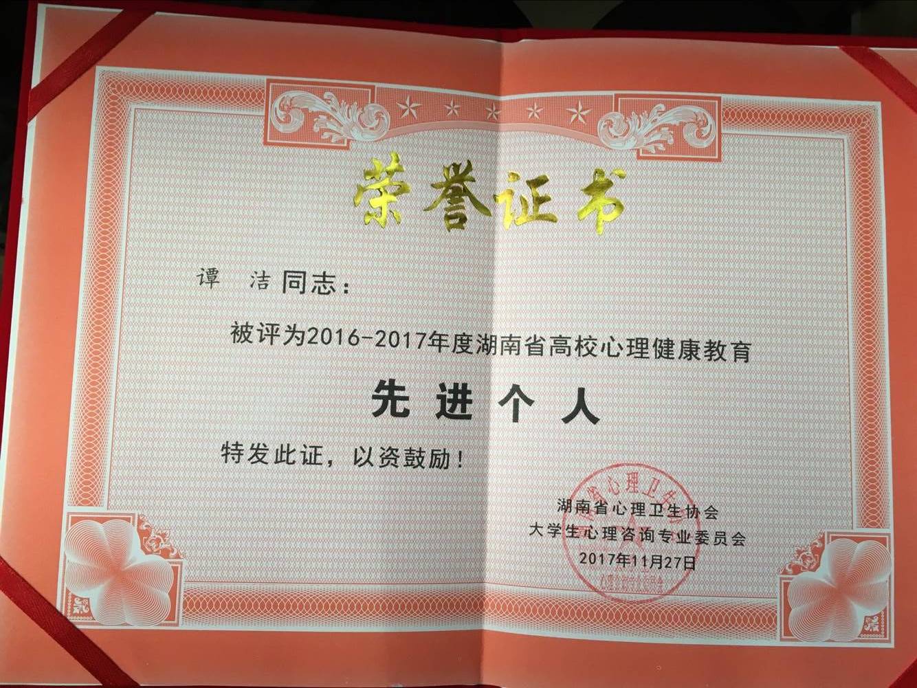 近日,湖南省心理卫生协会大学生心理咨询专业委员会年会在长沙召开,学院被评为“2016-2017年度高校心理健康教育先进单位”,旅游系辅导员谭洁老师被评为“心理健康教育先进个人”。