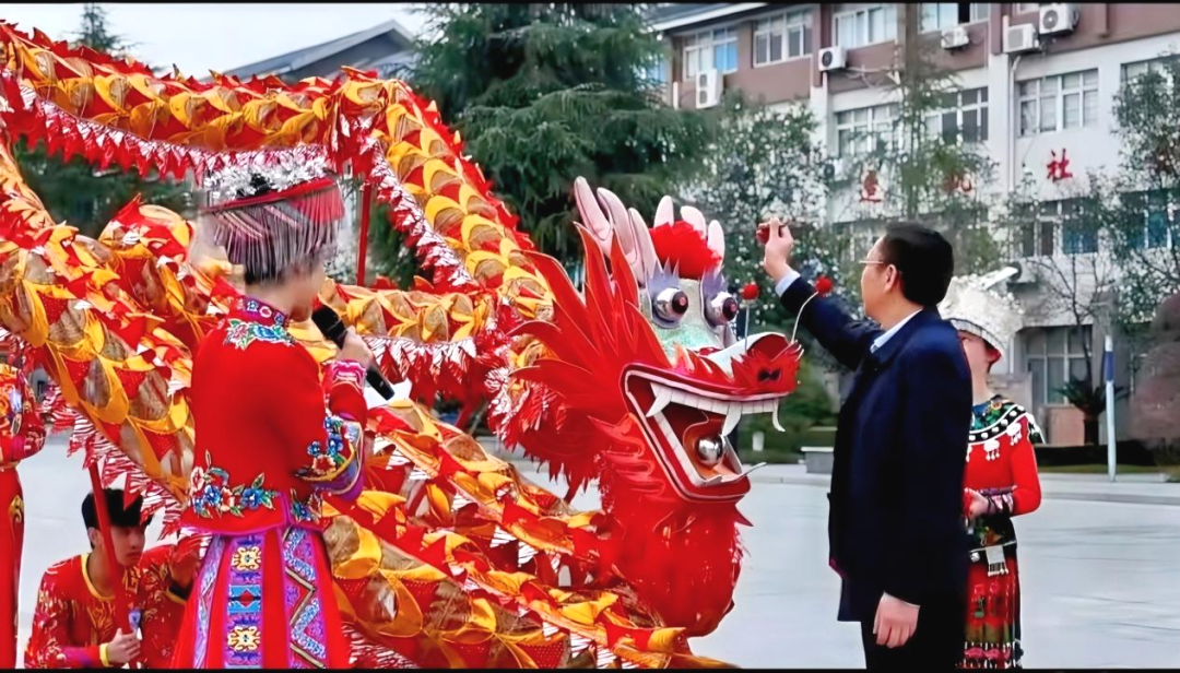 活动在庄重而富有寓意的点睛仪式中拉开帷幕。我校党委委员、副校长陈杨晖受邀上台,手持朱砂笔为祥龙点睛。这一传统仪式不仅赋予祥龙灵动生命力,更寄托着对学校、师生的美好祝福。