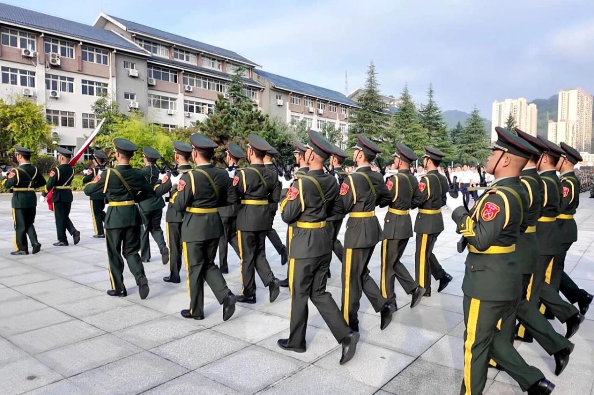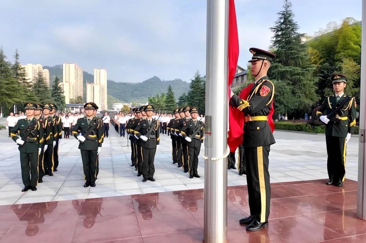 晨光中,国旗护卫队步伐铿锵,庄严护送国旗入场。伴随着激昂的国歌声,五星红旗冉冉升起,迎风飘扬。全场教师肃立行注目礼,正在参加军训的全体新生行军礼,共同见证这一神圣时刻。
