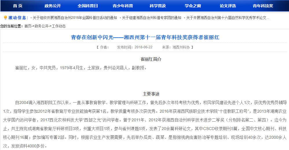 初心写就青春人生——记湘西州第十一届青年科技奖获得者崔丽红