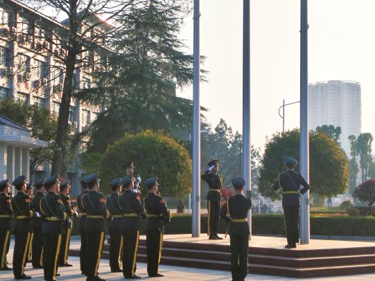 随着雄壮激昂的国歌声响起,五星红旗在晨风中缓缓升起,迎风飘扬。全体师生面向国旗,肃然而立,行注目礼,心中涌动着对祖国的无限热爱和崇高敬意,眼神中闪烁着对未来的憧憬和期待。