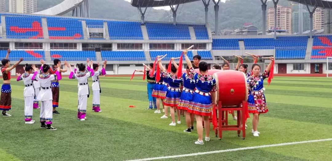 精彩的民族文化表演把活动推向了高潮:由60余名身着苗族服饰的学生和体育组四位老师参加表演的八合鼓武,伴着刚柔相济的音律跳荡,鼓手们于勾拉手、推拉掌、弓马步、腾转身中身走龙蛇,雄浑有力气振山河,尽展苗族人民敢爱敢恨、热情奔放之态。接着,由龙凤社区党支部展演的苗族花鼓作为压轴节目,鼓手们精神抖擞,节奏明快,动作大方,舞姿轻盈,强劲的传统苗族鼓文化气息就迎面而来。田径场上鼓声阵阵,欢声笑语,其乐融融。现场观看表演的师生和群众,感受到了苗鼓的魅力,也对湘西苗族鼓舞文化产生了浓厚的兴趣,大家表示愿意接受并长期坚持学习苗族鼓舞。