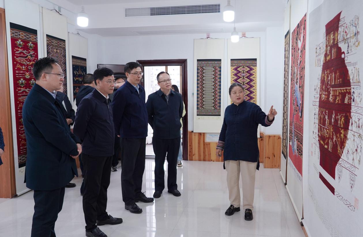 王仁祥一行走访参观了学校非遗展示馆、大师工作室、十八洞苗绣产业学院,了解土家织锦、苗绣、蜡染、苗画、木雕等非遗项目传承与创新情况,并与学校非遗大师进行深入交流,对产业学院在校企合作方面取得的成果给予了充分肯定。