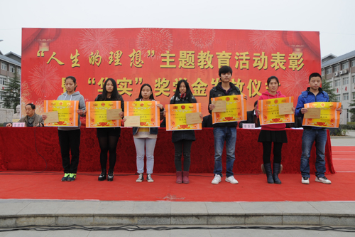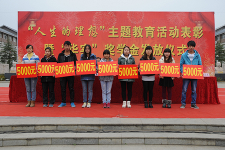 为激励学生刻苦钻研,发奋学习,立志成才,2013年12月10日下午,学院在中心广场隆重举行了“人生理想”教育表彰大会暨“华实奖助学金”发放仪式。学院党委书记吴正有,党委副书记、院长李光寒,副院长杨建平,院关工委副主任胡和生等领导出席大会。学生处处长单新德主持大会。