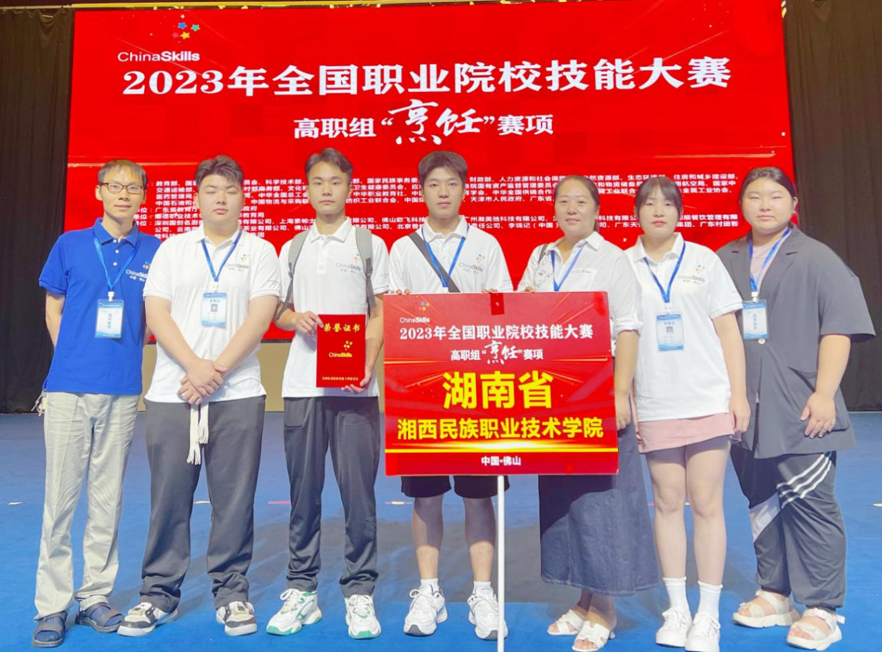 7月31日,从广东佛山传来捷报。2023年全国职业院校技能大赛高职组“烹饪”比赛圆满落幕。由湘西民族职业技术学院旅游管理学院陈群群、张琼两位老师指导的吴昌、李钊、陈群、张威四名学生,获得团体三等奖。