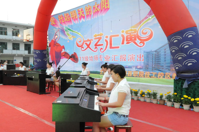 我院技工校区幼师专业每学期通过举办文艺汇演,为学生提供展示才艺的舞台。为了这次演出,2011级幼师专业的四个班学生精心编排,准备了24个节目呈现给观众。在当晚的演出中,学生用钢琴演奏儿歌、诗文朗诵、舞蹈、手工作品展示、儿歌演唱等形式展现自己幼教才艺,表演充满了青春活力,富有幼教特色,在场观众不时为她们的表演发出热烈掌声。整场演出内容丰富、格调高雅,充分展现了我院幼教专业丰硕的教学成果,体现了幼师专业学生良好的专业素养和扎实的基本功。