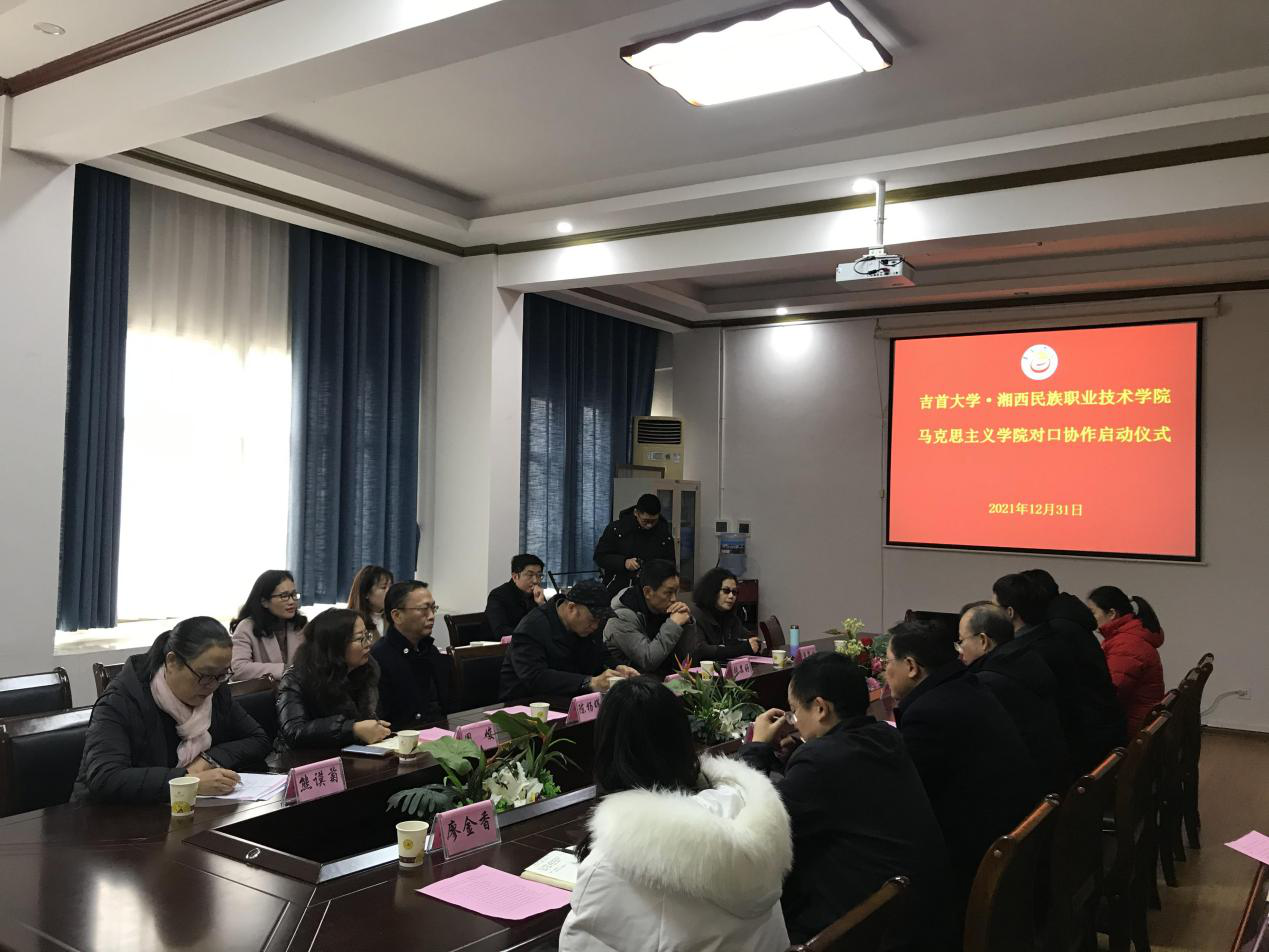 12月31日,我院党委副书记、副院长宋清华,学院党委委员、纪委书记张显好,学院党委委员、副院长陈杨晖、周峻,学院党委委员、湘西经济贸易学校党委书记曾翠林,思政部主任熊谟菊、思政部各教研室主任一行10 人到吉首大学马克思主义学院参加湖南省高校马克思主义学院对口协作签约仪式。