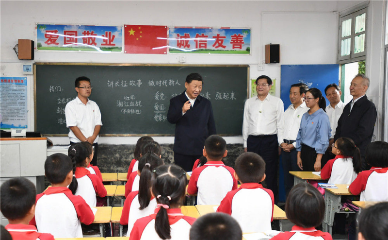 9月16日至18日,中共中央总书记、国家主席、中央军委主席习近平在湖南考察。这是16日下午,习近平在郴州市汝城县文明瑶族乡第一片小学,同正在上思政课的同学们亲切交流。新华社记者 谢环驰 摄
