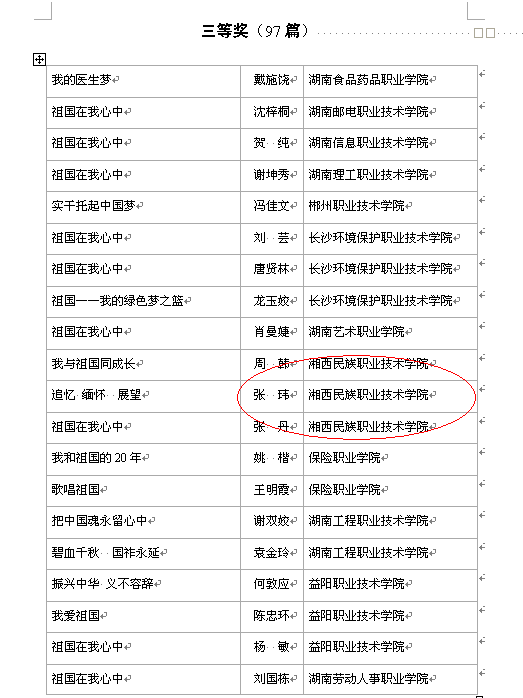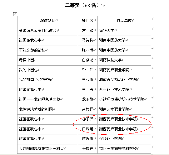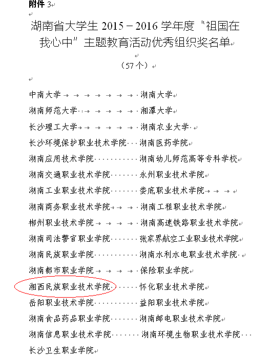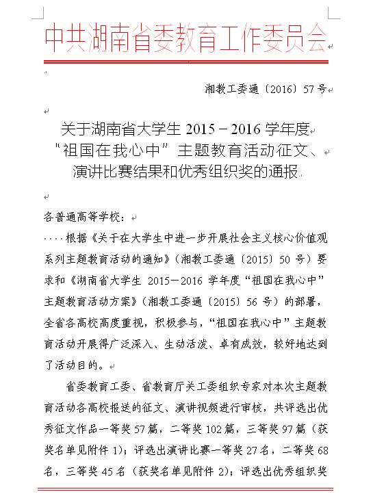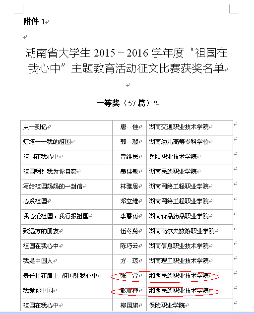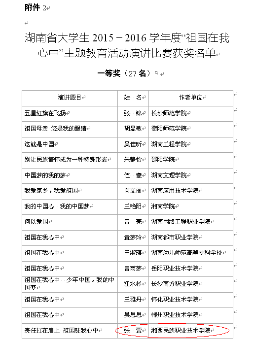 在全省高校2015—2016学年度“祖国在我心中”主题教育征文和演讲比赛中,湘西职院选送征文5篇、演讲视频3个。经省教育厅关工委组织专家评审,参赛学生全部获奖,以优异的成绩为学院争得了荣誉。征文比赛:获一等奖2名,三等奖3名;演讲比赛:获一等奖1名,二等奖2名;学院关工委荣获全省高校主题教育优秀组织奖。