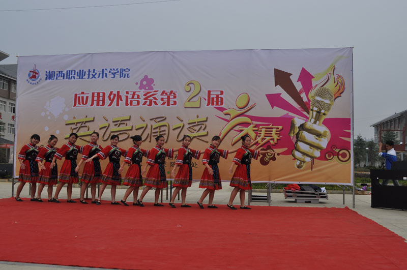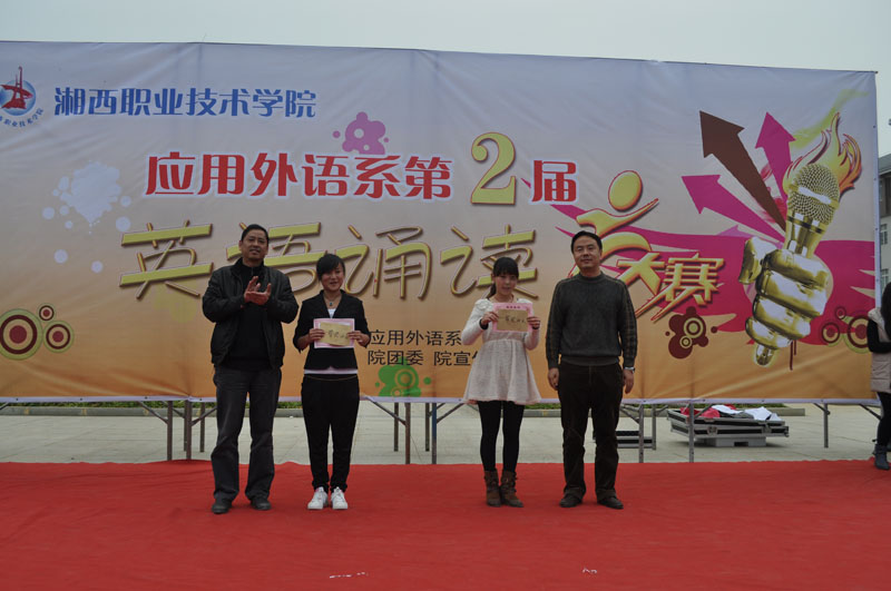七名靓丽女生用充满青春活力的舞蹈《向前冲》为比赛拉开帷幕。接着比赛中,选手依次登台,他们诵读口语流利,语音标准, 声情并茂,充分展示了自身扎实的英语基本功,精彩的表现引来观众的热烈掌声。同时,比赛途中穿插有观赏性强的歌舞节目,吸引大批观众驻足观看,每每主持人为观众报出评委给优秀选手打出的高分,更是将比赛现场的气氛一次次推向高潮。经过激烈的角逐,11-5)高英3班的麻满芝同学、09高英1班的刘永红同学分别摘得低年级组、高年级组英语诵读竞赛桂冠,11-5)高英3班张桂群、石妮、10高英02班张柏玉、11-5)高英2班汪月、09高英1班王珊、08高英3班孙金燕、09高英1班向吉莹、08高英3班张利等18名同学荣获此次比赛的二、三等奖。