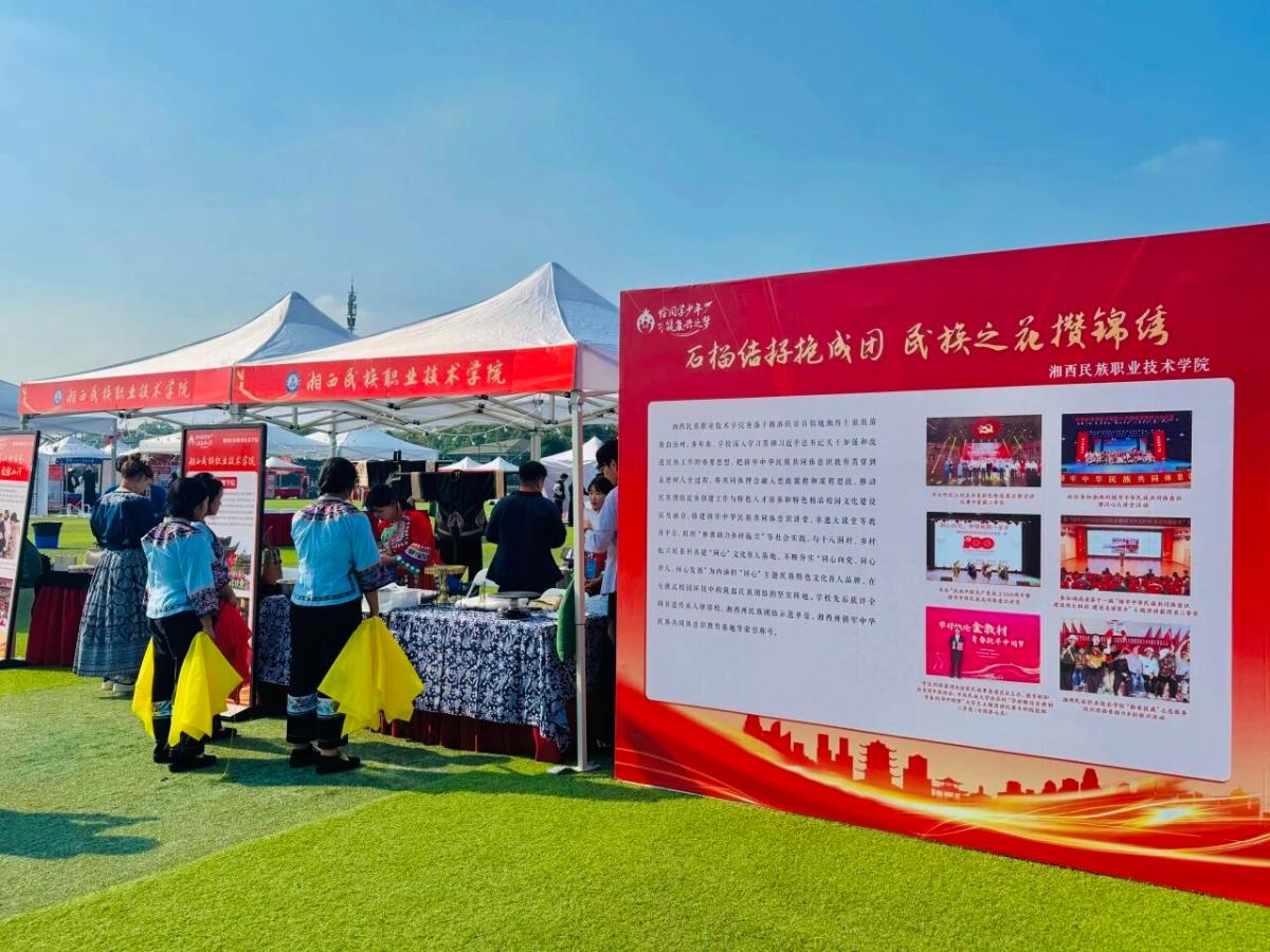 在精心布置的展示区域内,我校展示了富有湘西特色的土家族、苗族非遗工艺作品、独具风味的民族美食等,生动呈现了我校以铸牢中华民族共同体意识为主线推动人才培养工作取得的系列成果。刚柔并济的苗鼓表演、土家织锦的古朴纹样、苗绣蜡染的独特工艺以及滋味独特的风味美食吸引了大量参展者驻足观看、互动体验。活动期间,隋忠诚、虢正贵等领导嘉宾来到我校展台,听取了现场师生关于展示内容与教育成果的介绍,并与他们进行亲切交流。