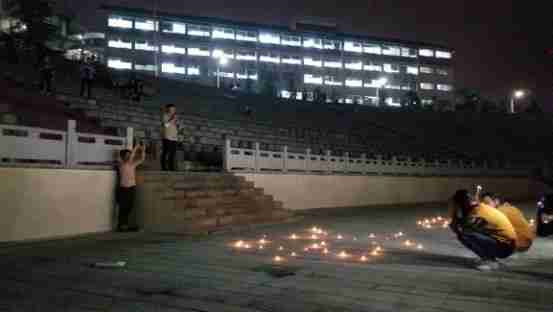 活动当晚,上百支蜡烛被点亮,学生们依次打开手电筒,在烛光的照耀下,现场格外庄重。从高处俯瞰,最外围的蜡烛拼成了“祖国你好”的字样,同学们围着烛光默默哀悼,以寄哀思。