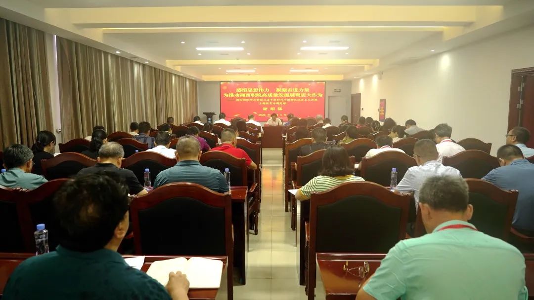 为推进学习贯彻习近平新时代中国特色社会主义思想主题教育走深走实,7月4日下午,湘西民族职业技术学院党委书记谢绍猛以“感悟思想伟力,凝聚奋进力量,为推动湘西职院高质量发展展现更大作为”为题,为学院中层以上干部讲专题党课。省委第三十一巡回指导组夏军、瞿振雄参加本次活动。