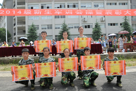 大会在全体起立高唱国歌的仪式中拉开了序幕。接着,各参演班级依次进行了立正、稍息、齐步、间歇左右转、敬礼等动作的表演。在会操表演过程中,同学们的动作整齐划一、铿锵有力,充分展示了14级新生良好的精神风貌。会操表演结束后,学生处负责人杨云宣读了《关于表彰2014级学生军训先进集体、先进个人的决定》,14-5高职汽修一班等16个班级被授予“军训先进班级”称号,14-5高职建筑二班等14个班级被授予“军训内务整理先进班级”称号,向光坤等191名同学被评为“军训先进个人”。参会领导分别为获奖集体和个人颁发了奖状、证书。