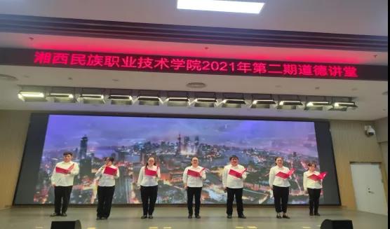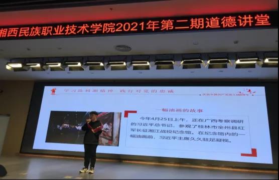 本次道德讲堂共有“唱一首歌曲、讲一个故事、看一部短片、送一部经典、谈一点感悟、作一番点评”六个环节。在“唱一首歌曲”环节中,师生齐唱桑植民歌《马桑树儿搭灯台》,一起回忆了过去湘西数千土家儿郎为了革命参军上战场的故事。随后的“讲一个故事”环节,湘西职院学生宣讲员郭洪松给大家讲述了“陈树湘和他的‘绝命后卫师’”,带领在场师生感悟了红军长征路上,红军34师付出巨大牺牲奋力掩护党中央渡过湘江、成功突破封锁的悲壮故事,在场的师生无不动容。