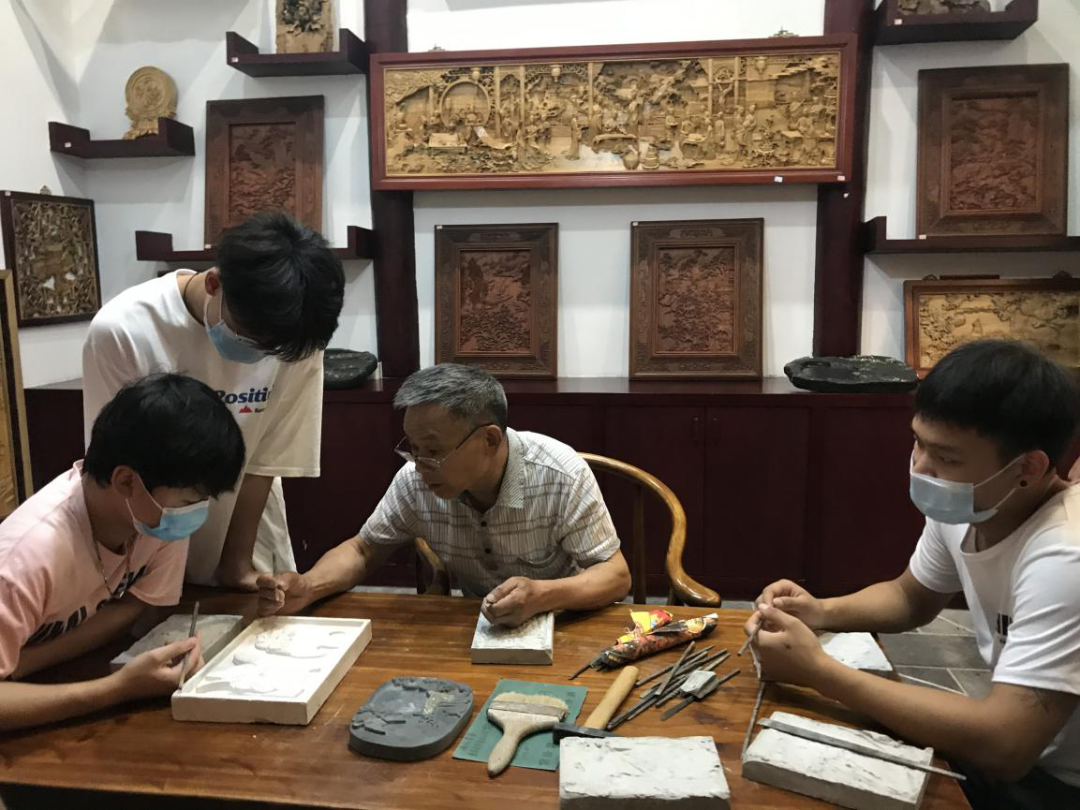 观赏完苗绣后,学生们纷纷来到“雕刻”大师工作室,被一位目光专注、面目清瘦、刀工娴熟的老人深深吸引。“此石具有色泽青灰、质细温润、不涸不燥储墨经久不干等特点”,杨光三大师正在向学生们介绍水冲石砚取材的石质特点。他一边演示砚台的雕刻技法,一边介绍水冲石砚的制作步骤。杨老师一辈子从事雕刻这件事,既体现了艺人的坚守,也展现了艺人的匠心。学生们在杨老师演示的过程中,了解到制作砚台不仅是一项技术活,更是一场自我的修行,要受得住寂寞,下得了苦功夫。