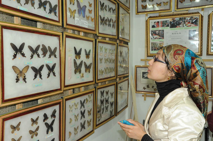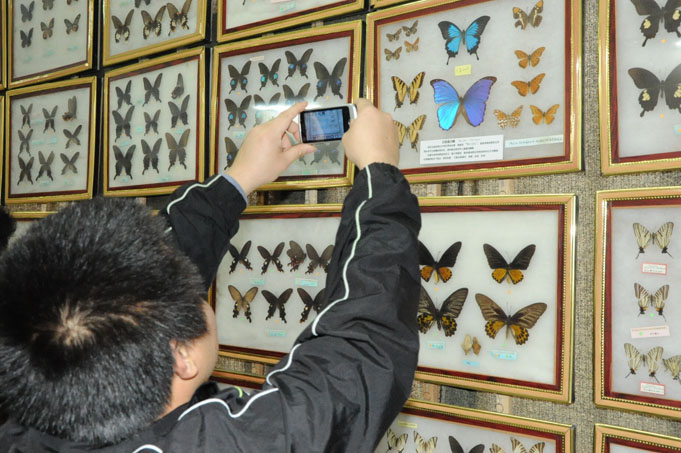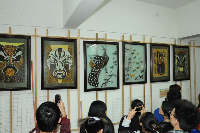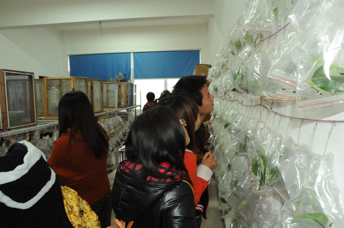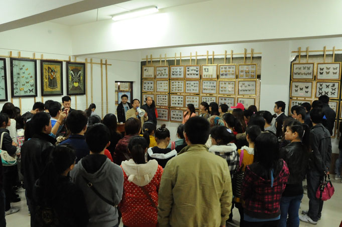 参观交流前,李文艺、罗恒先后为同学们简单介绍了学院基本情况以及参观地——“蝴蝶园”的基本情况。随后,在几位老师带领下,同学们兴致勃勃地来到实训楼B栋四楼的蝴蝶养殖园及标本陈列室。在陈列室内,数千只蝴蝶标本在灯光映衬下显得格外亮丽,学生被蝴蝶身上所展现的缤纷艳丽、五彩斑斓的色彩深深吸引。在罗恒老师的边解说边指引下,大家猛然看到陈列室的几幅漂亮的画竟然是采用蝴蝶翅膀制作,更是惊讶,在称赞罗老师的蝴蝶艺术的同时,更是感叹大自然所赋予的无与伦比的美丽。在蝴蝶养殖园,罗恒老师还对蝴蝶的生长发育、繁殖、生活习性、种类等知识性向同学们作了讲解。