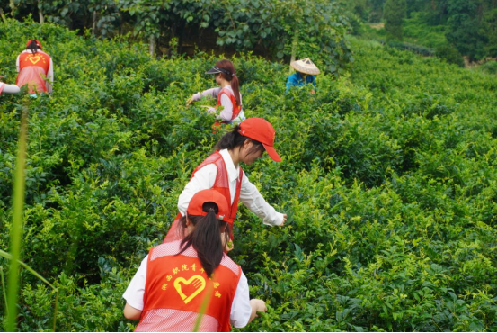 在雪茶种植基地,村支书亲自给成员们一一教授采茶方法,成员们掌握技巧后便迅速融入到当地茶农采茶队伍中。“俺们四五点就起来采茶叶了咧!”“可以~你们采得真好嘞。”山中茶香浓,人在采茶间,放眼望去,茶园青山绵延起伏,夏日里的美好活力和青春相映照。
