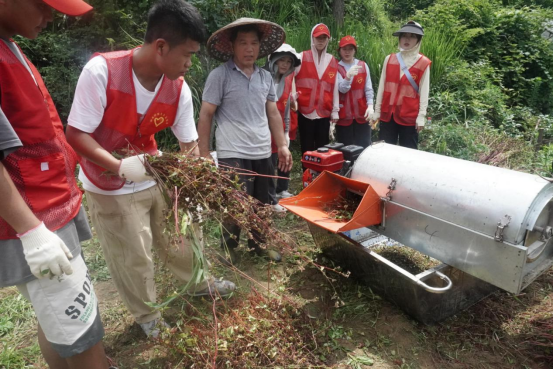 “大家在收割荞麦时,要将根部泥土去除,把割好的荞麦秆根对根,叶对叶摆放。”成员们认真聆听村支书的耐心讲解,采取“流水线”作业形式,挥舞着镰刀在田间地头埋头收割,并利用打谷机对荞麦进行脱粒、分离、筛选以及分装,蔚蓝的天空和红色志愿服交相辉映。