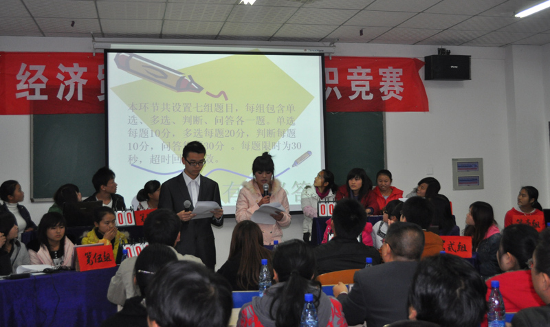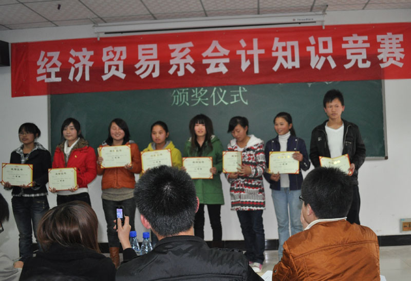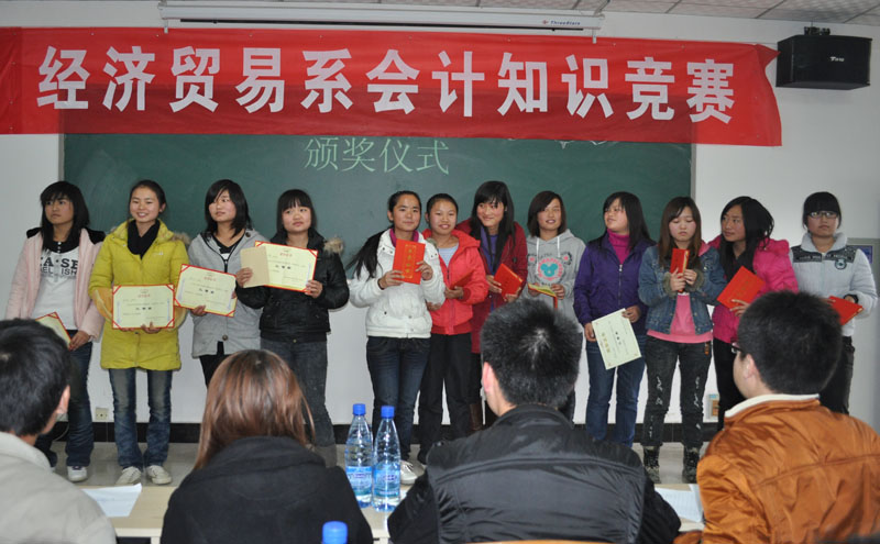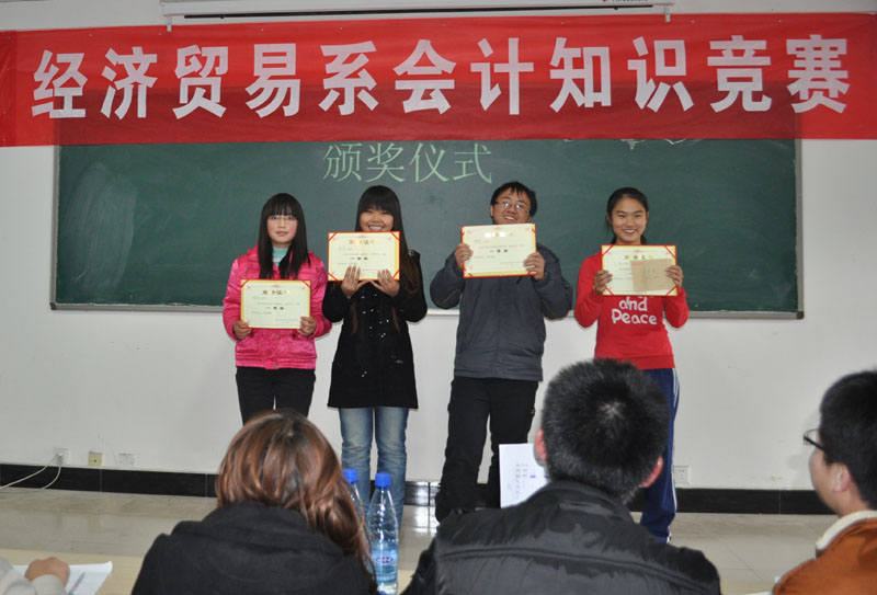 2010 12 7 下午,经济贸易系在教学楼B501举行首届会计知识竞赛,共有24名选手参赛。本次竞赛由经贸系会计教研室主办,由经贸系学生会协办。大赛同时得到了学院各级领导的高度重视,李光寒院长也十分关心竞赛的策划与组织工作,教务处、学生处领导亲自来到决赛的现场观看比赛。