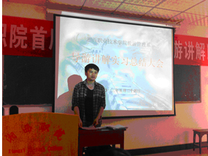 为更好地总结经验,不断完善该教学模式,2013年5月24日中午1点,2013年导游讲解教学实习总结表彰大会在B503教室举行。此次总结表彰大会由旅游管理系副主任刘芳主持,会上,旅游管理专业教研室主任梁琴对此次实习进行了全面总结;实习生代表在会上交流了实习心得体会;同时,对在这次实习中表现突出的闵本湘、欧之光、唐玉爱、黄宇、龙翠群、龙璨等六位同学进行了表彰,张琼副主任与其他实习指导教师为受表彰的同学颁发了优秀实习生荣誉证书和奖品;王小平主任在会上作了重要讲话,对这次实习给予了高度肯定,并对进一步完善该教学模式作出了重要指示,对学生后阶段的学习提出了殷切希望和要求。