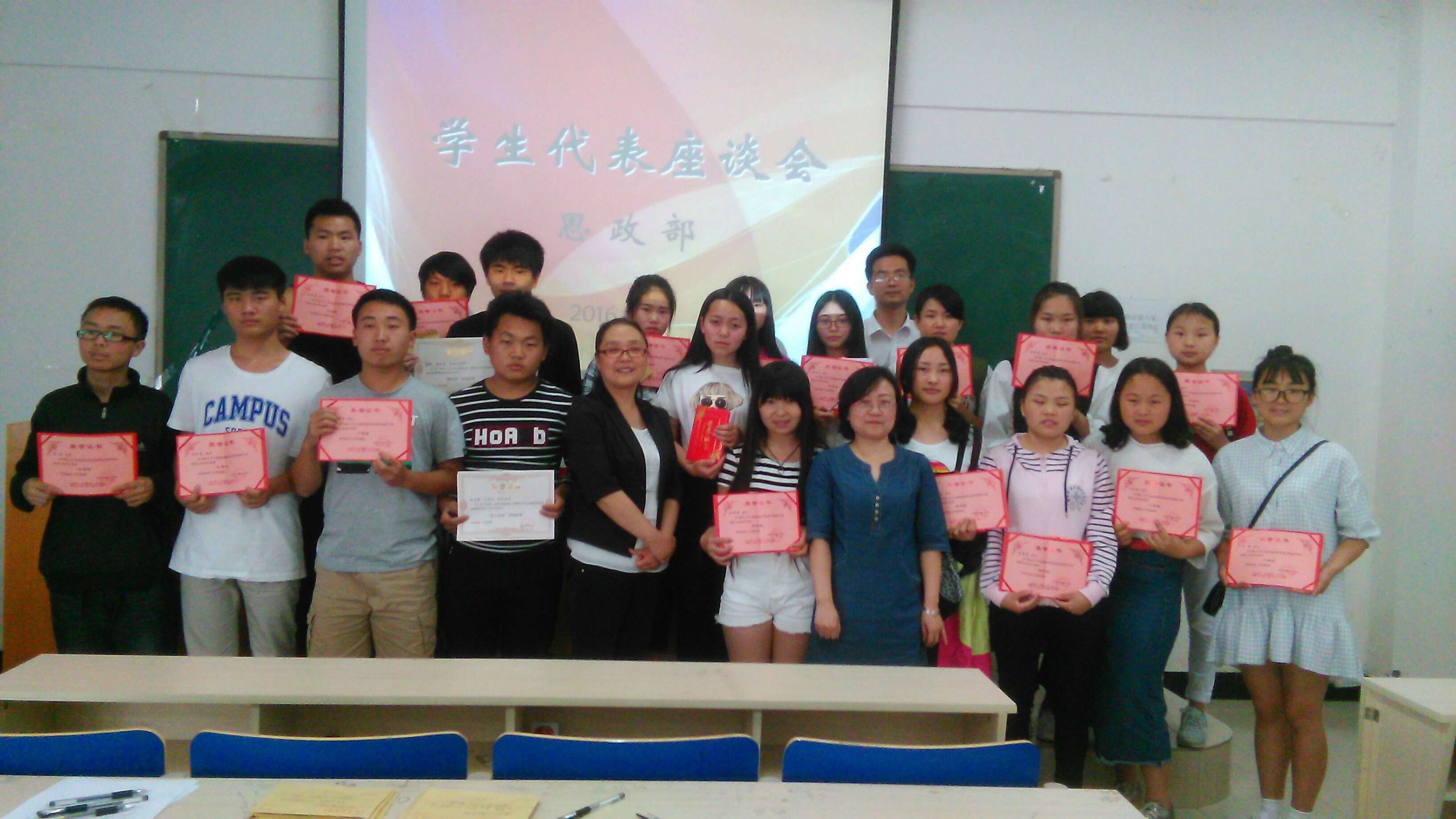 此外,在座谈会上,思政部还为2015年在大学生思想政治理论课实践教学成果展示活动中获得省级奖励的8名同学及获得院级奖励的的82名同学进行了颁奖。熊谟菊在颁奖致辞中希望获奖的同学再接再厉,希望学院广大学生能以获奖同学为榜样,在学习、生活中积极弘扬主旋律,传播正能量,用实际行动践行社会主义核心价值观,做守纪、文明、先进的大学生。