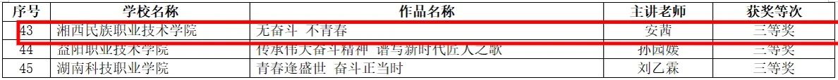在“奋斗青春号”主题班会活动中,湘西职院彭浩《奋斗青春号》荣获二等奖,徐海燕《汗水书写青春,奋斗筑梦未来》荣获三等奖;在“奋斗青春号”微课竞赛活动中,宋凯《让青春在全面建设社会主义现代化国家的火热实践中绽放绚丽之花》荣获三等奖,安茜《无奋斗,不青春》荣获三等奖;在“奋斗青春号”视频展播活动中,武吉文《鼓武青春(系列)》荣获二等奖。