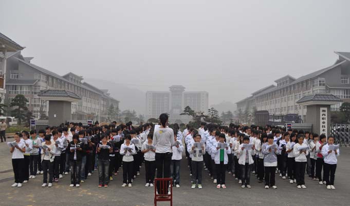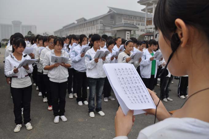 老师呼,应勿缓;老师命,行勿懒;老师教,须敬听;老 师责,须顺承……” 9 20 早晨,应用外语系团总支组织200名学生排成整齐的队伍,齐声朗诵《弟子规》,并向全院老师行鞠躬礼, 以这种方式感谢可亲可敬的老师。